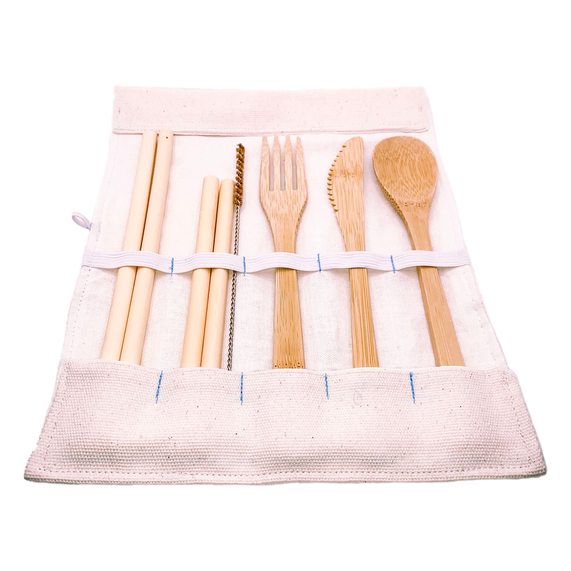 We offer a bamboo cutlery kit in its linen storage case.