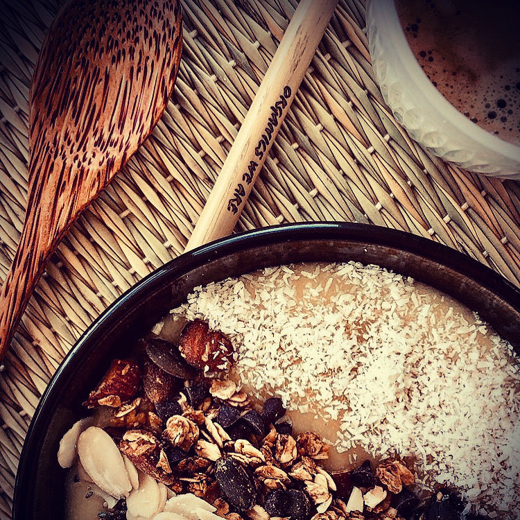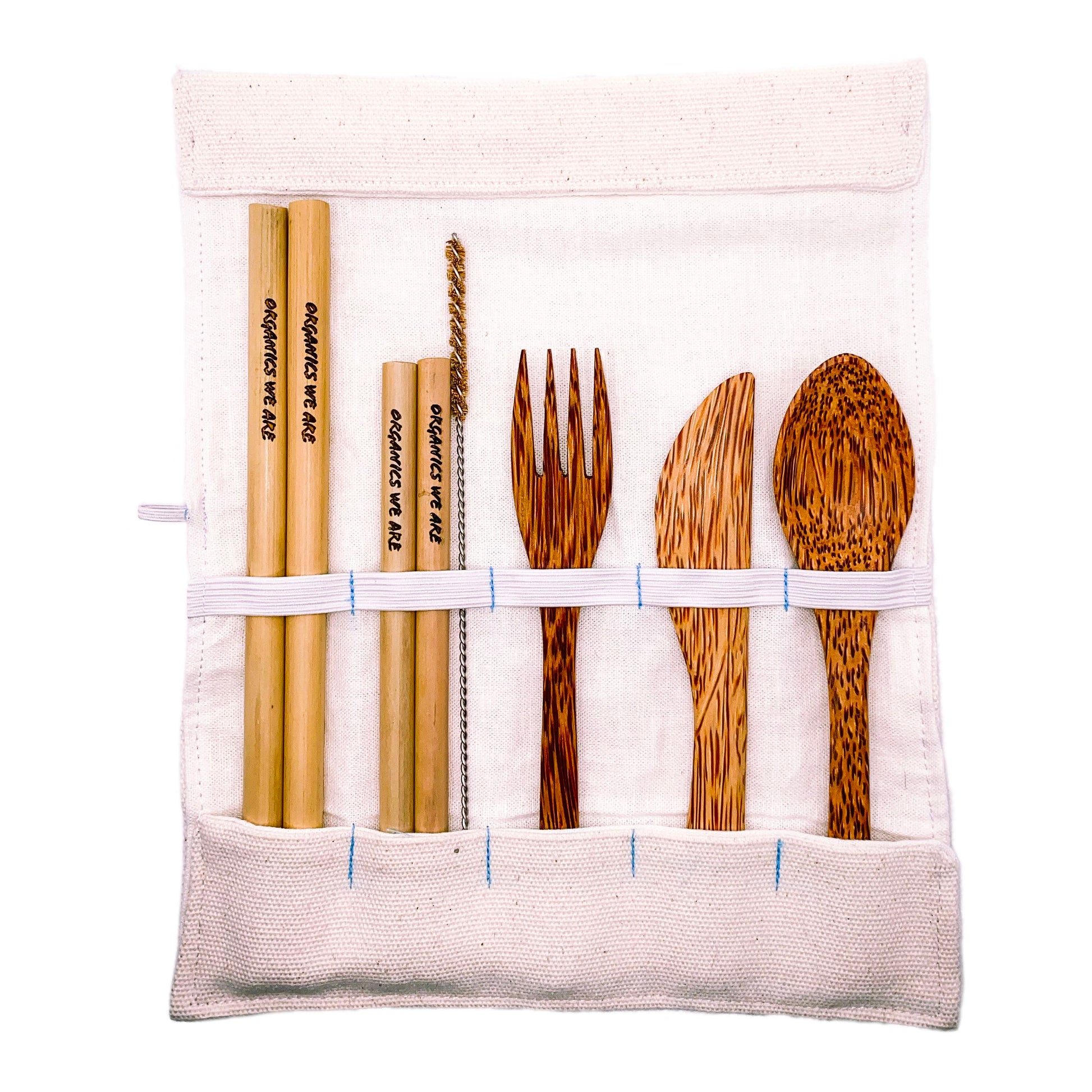 We offer a cutlery kit including "Organics We Are" bamboo straws with a cleaning brush as well as a set of coconut wood cutlery in its linen storage case.